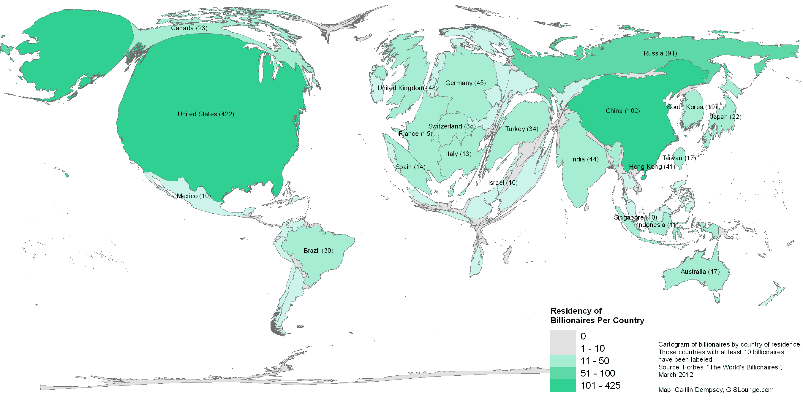 億万長者(純資産が10億ドル以上の人)が住む国の世界地図