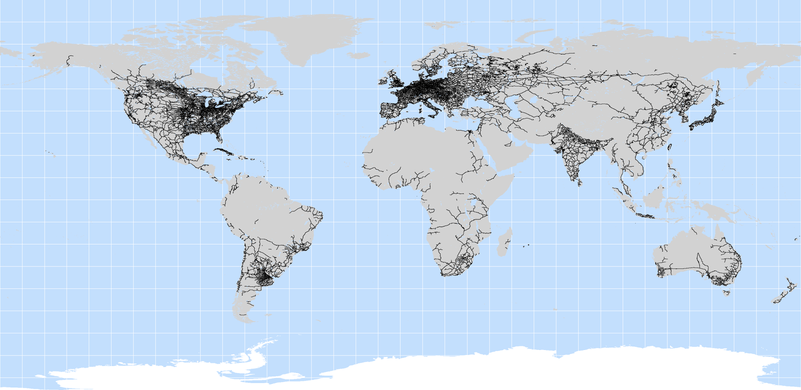 上に示した地図は、世界中の鉄道路線がどのように敷設されているのかを黒い線のみで強調した世界地図です。この地図により、世界各国の鉄道普及状況がひと目で分かるようになっています。