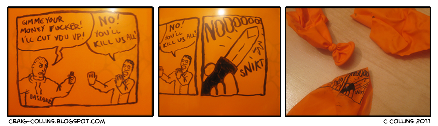 風船に描かれたマンガ「金を出せ!出さないと刺すぞ・・・」
